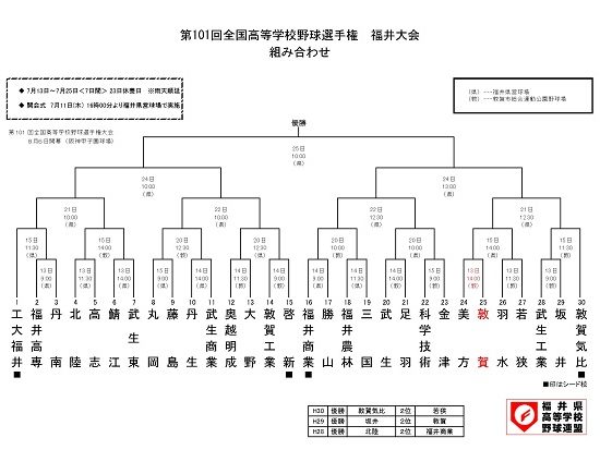 県独自の代替大会「福井県高等学校野球大会(令和2年度夏季)」 敦高は、7/23(金)海の日、11:30〜 敦賀市運動公園野球場にてプレイボールです。 組み合わせ表
