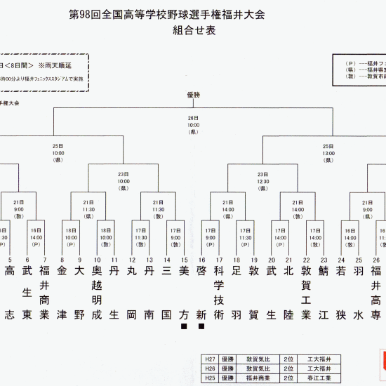 第98回全国高等学校野球選手権大会 福井大会組み合わせ Posted on: 2016年7月1日 by: 管理者 Comments: Leave a comment 本日7/1組み合わせが決定いたしました 一回戦は、7/17(日)福井フェニックススタジアム 11:30~ 次は、啓新と科学技術の勝者との対戦となります 皆様の応援をよろしくお願いいたします h28natsu-kenContinue Reading...