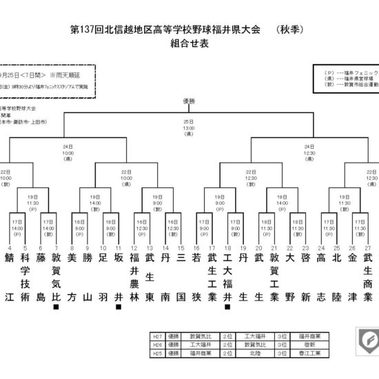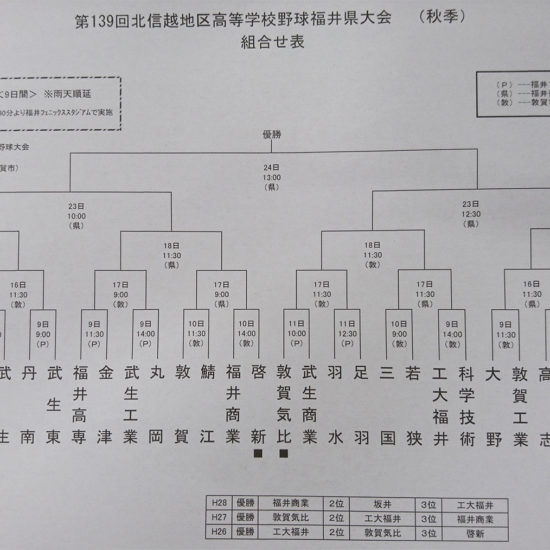 第137回北信越地区高等学校野球福井県大会(秋季) Posted on: 2016年9月9日 by: 管理者 Comments: Leave a comment 今日、組合せが決まりました! 9/18(日)14時 福井フェニックススタジアムにて 福井高専と福井商業の勝者と対戦いたします 応援よろしくお願いいたします ※福井県高等学校野球連盟よりContinue Reading...