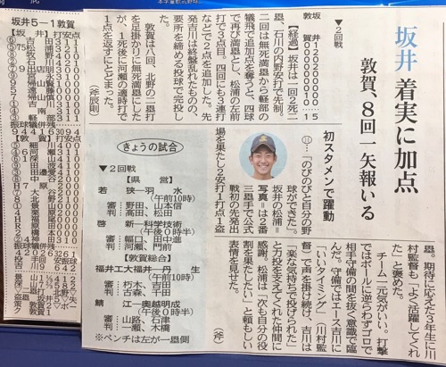 第98回 全国高等学校野球選手権福井大会 【一回戦】足羽3-4敦賀 【二回戦】啓新14-0敦賀(5回コールド) 第50回 敦賀市長旗争奪高等学校野球大会 【二回戦】敦賀6-5敦賀工業 【決 勝】敦賀1-20