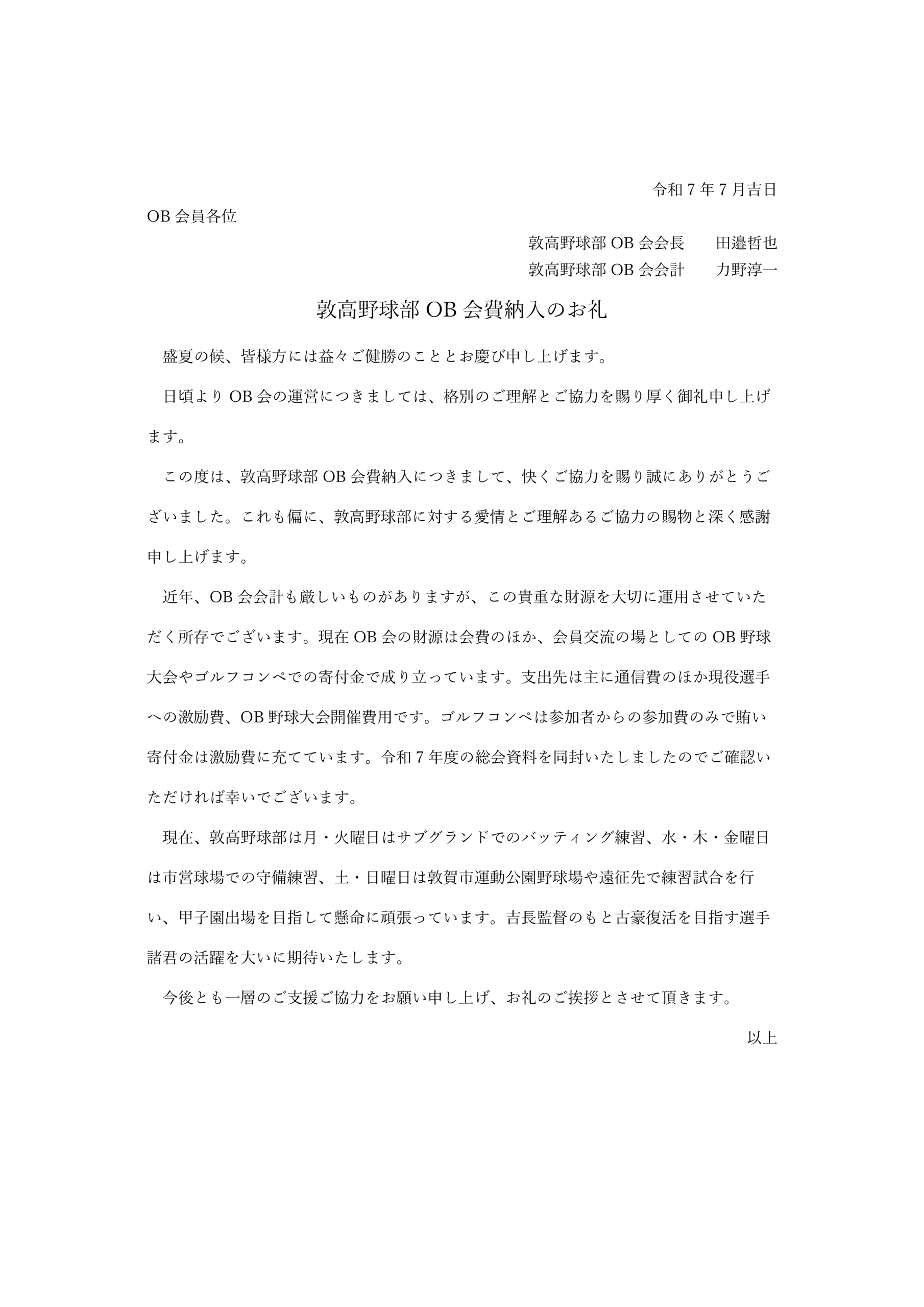 敦賀高校野球部OB会 会費納入のお礼 Posted on: 2025年7月4日 by: tatsuya_i OB諸氏のの皆様、日頃より敦高野球部OB会の活動にご理解とご協力をいただきありがとうございます。 OB会会費を納入いただいた皆様へのお礼状になります。 今後ともどうぞよろしくお願い致します。
