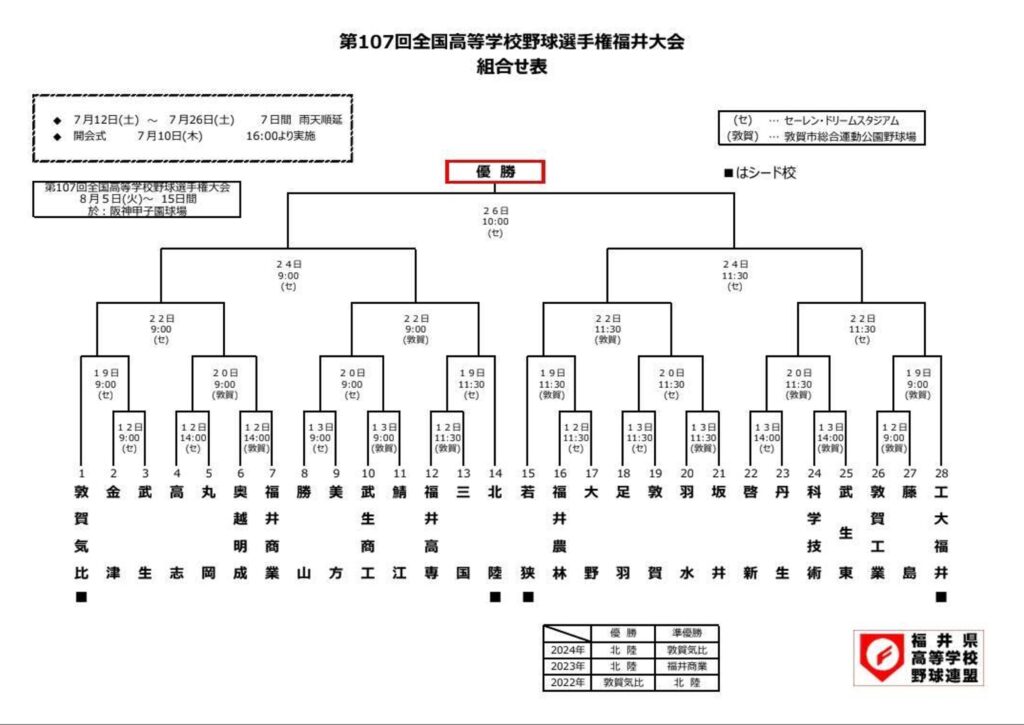 敦賀高校は7月13日(日)11:30より足羽高校とセーレン・ドリームスタジアムで1回戦が予定されております。