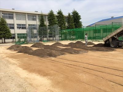 整地しました。敦賀市営球場にある補充用の土をいただいて