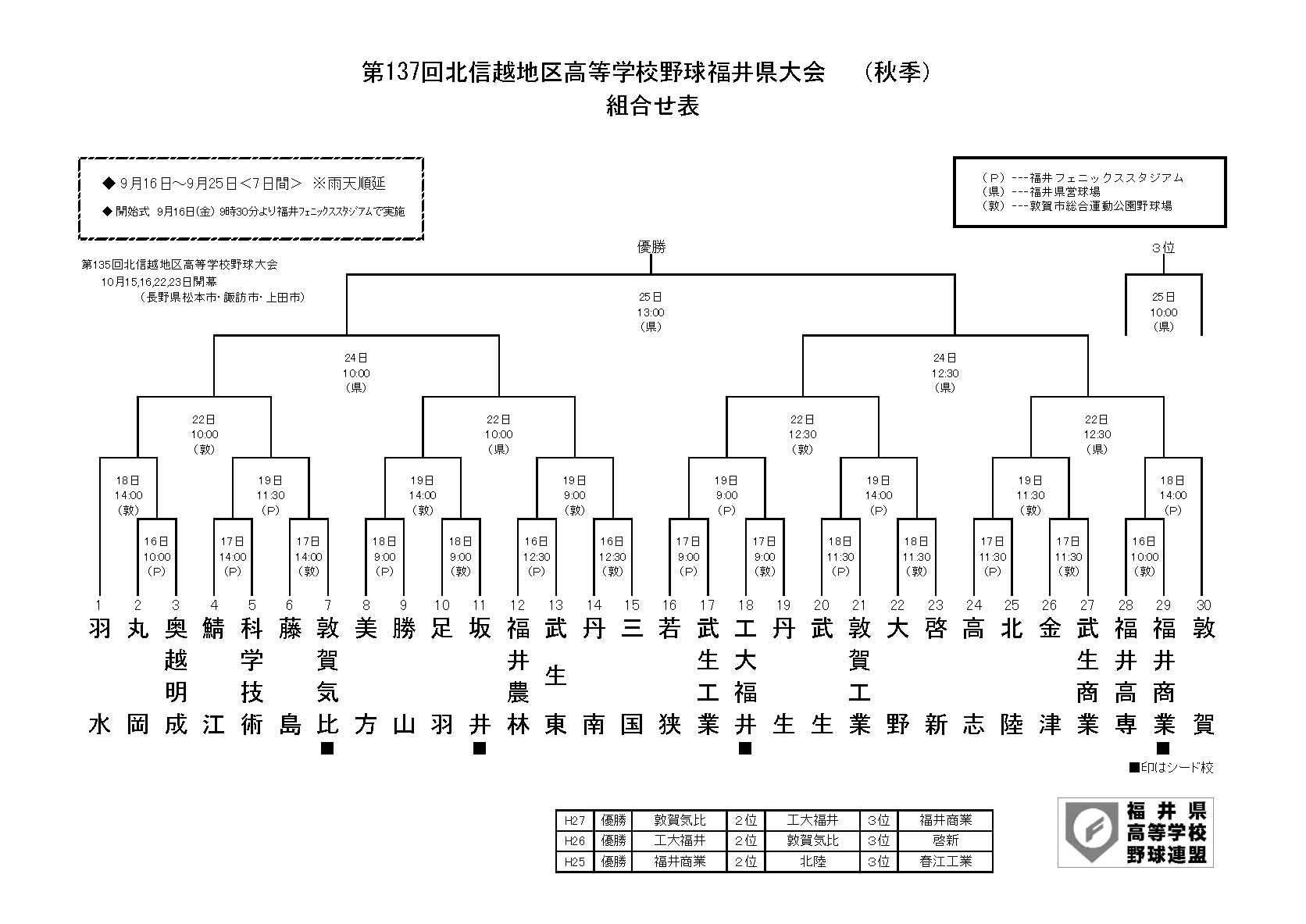 第137回北信越地区高等学校野球福井県大会(秋季) Posted on: 2016年9月9日 by: 管理者 今日、組合せが決まりました! 9/18(日)14時 福井フェニックススタジアムにて 福井高専と福井商業の勝者と対戦いたします 応援よろしくお願いいたします ※福井県高等学校野球連盟より