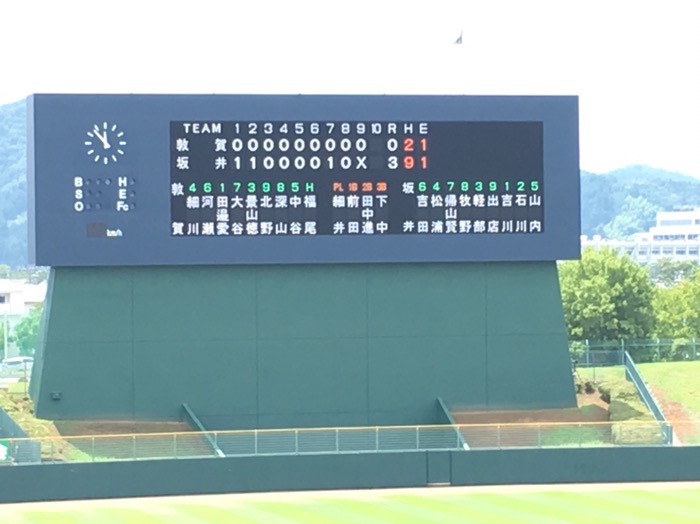 一歩とどかず Posted on: 2017年7月27日 by: 管理者 何がたらなかっのでしょうか? 選手達の体調、ピッチャーの肩の状態、集中力の継続。相手チームも同じ条件のはず。 あと少し、あと少し。「甲子園」と言う場所まで…。 選手達の一塁までの全力疾走&ヘッドスライディング。 選手達の礼儀正しい挨拶。 選手達の感謝を伝える心。 あと少し、何かが敦高の選手達の味方になってくれれば。 敦賀 000 000 000|0 坂井 110 000 10×|3 この敗北、悔しさは次の世代の選手に伝えていかなければなりません。 ナイスゲーム‼️敦高