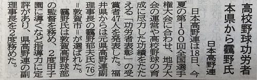 高校野球功労者表彰について Posted on: 2018年5月22日 by: 管理者 敦高野球の監督を務め、二度の甲子園出場を果たしました「靏野郁夫氏」が高校野球の育成に尽力した構成kをたたえる「功労者表彰」に選ばれました。 【福井新聞より】